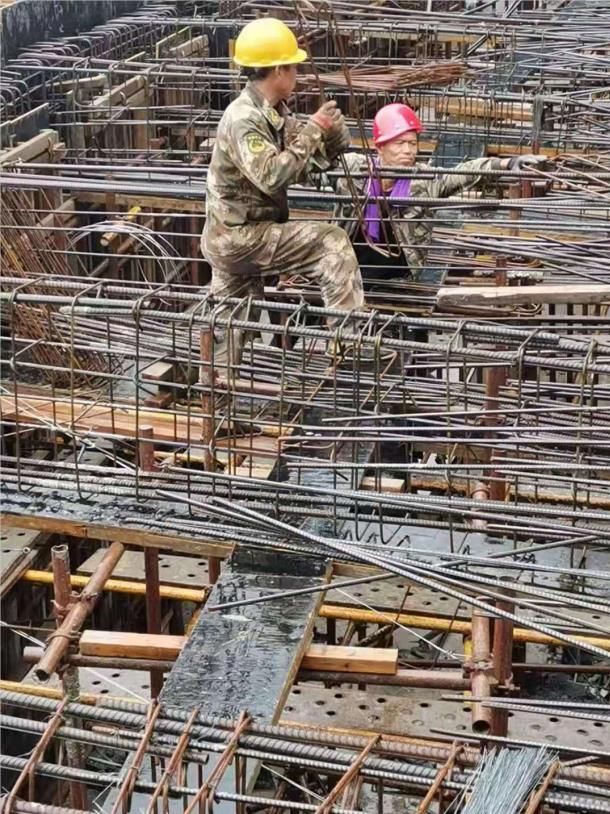 走进施工现场,施工工地依然人来人往,三三两两的工人们正在你抬我扛的忙碌着,施工作业人员更顶着绵密的细雨进行钢筋绑扎,木工支模,楼体上的钢筋早已织成一张巨网,坚实而紧密,项目部的施工负责人也都在现场指导浇筑砼等工作。