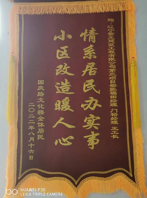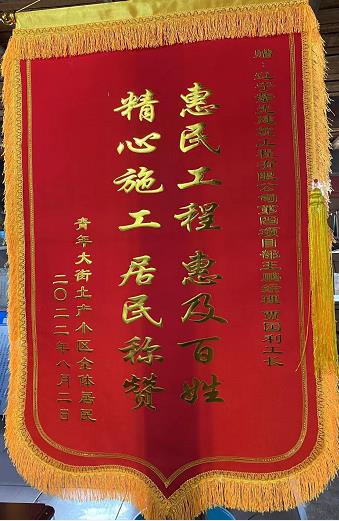 2022年8月两个项目部分别收到了居民赠与的锦旗沉甸甸的锦旗,蕴含着老百姓对公司老旧小区改造工程的支持与肯定让我们真切的感受到大家对我公司工作的认可,同时也体现了政府对百姓生活的关爱以及带来的福果。本公司将切实履行好相应职责,将老旧小区改造真正改到百姓心坎上将创紫光品牌,筑百年企业的企业经营目标一步步落实到实处!
